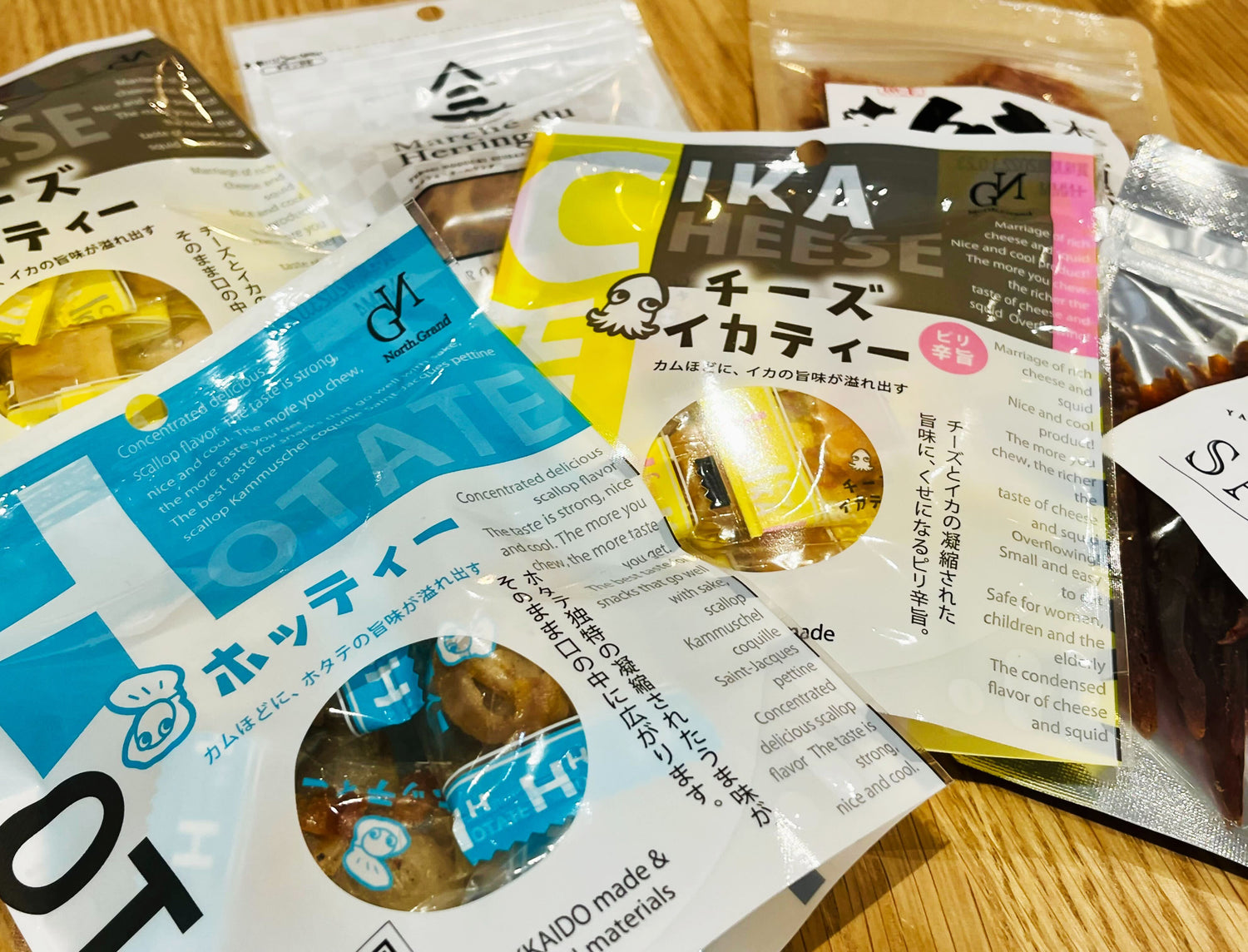 種類が豊富なおつまみの中で一番の人気商品はホタテの燻製「ホッティー」。ホタテの旨味がぎゅっと凝縮されたイチオシのおつまみです。